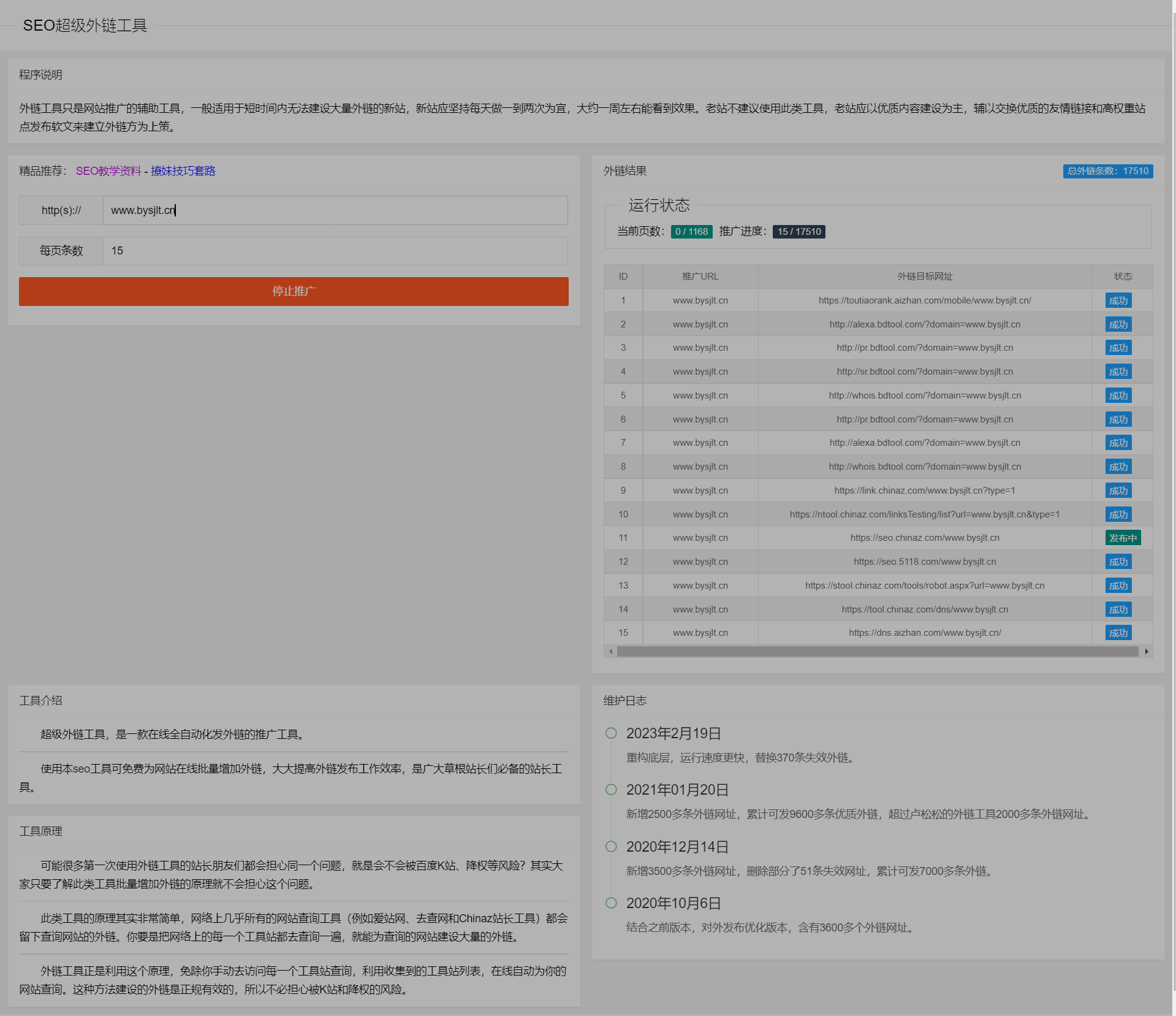 在线SEO外链工具源代码html源码,是一款在线全自动化发外链的推广工具。使用本工具可免费为网站在线批量增加外链,大大提高外链发布工作效率,是广大草根站长们必备的站长工具。
