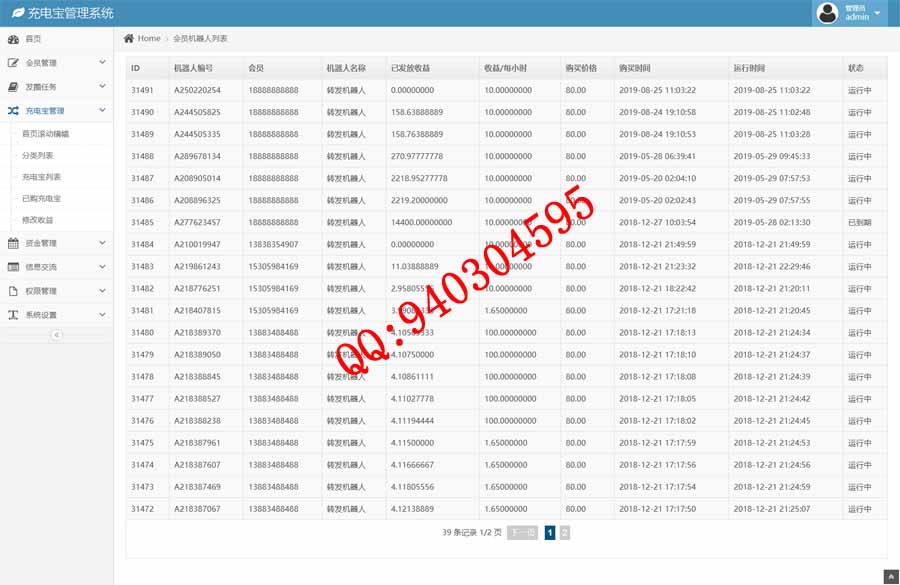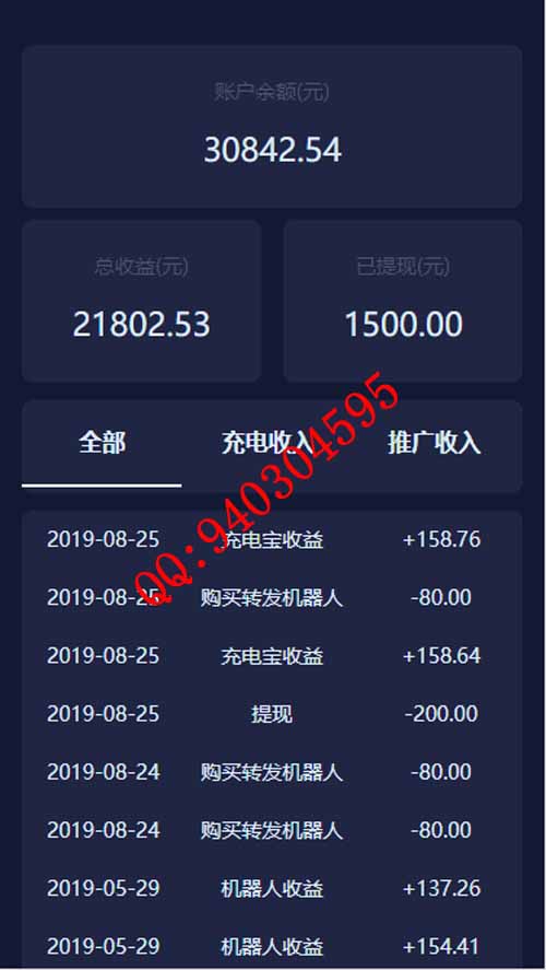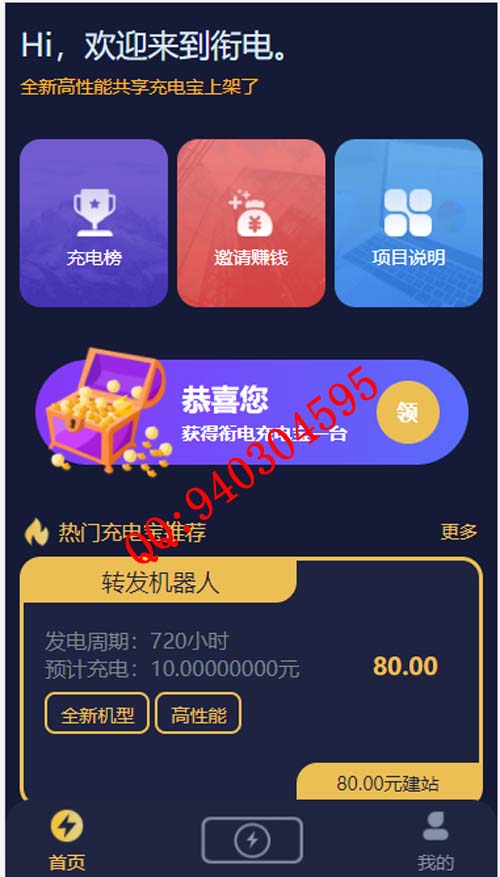 近期非常热门街电,共享充电宝,挂机自动赚钱机器人,仿云海广告云点机器人,在云点机器人广告的基础上更新了充电宝UI界面,Thinkphp充电宝赚钱机器人合约源码,支付对接码支付,短信对接短信宝,后台增加机器人。