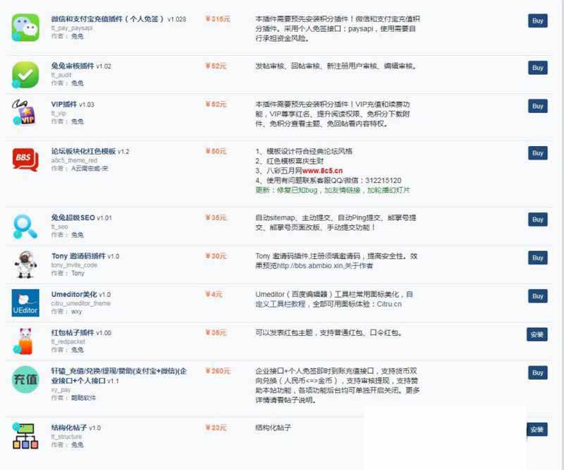 注:某些插件可能没有安装文件,需要你导入数据库文件sql 然后后台插件里面就会显示。还有因为不是在线安装,有的插件显示安装,请卸载了在次安装这样插件就正常可以使用。