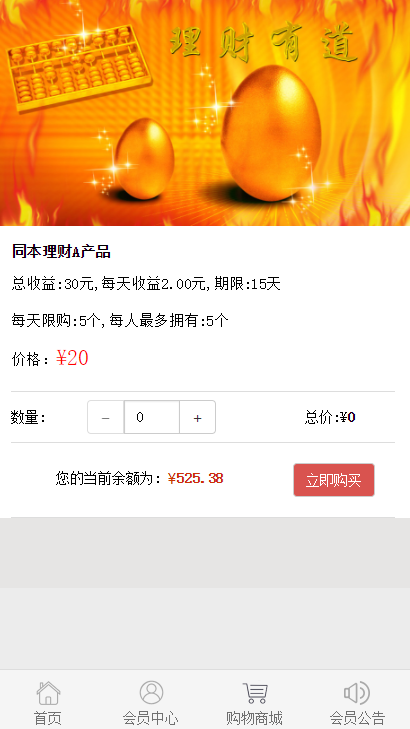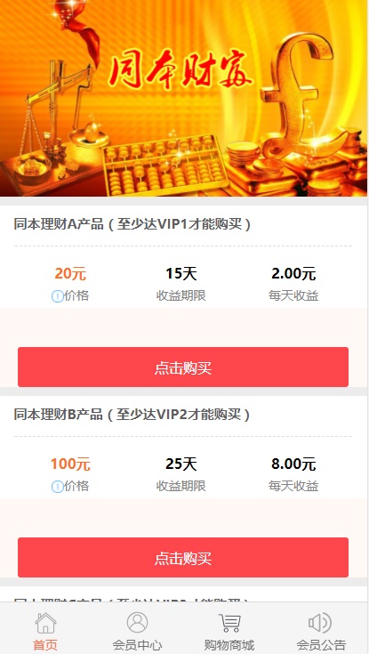 4)投资500元,每天分红20元,75天出局,总收益:1500元,每人最多购买20个,VIP4及以上会员才能购买。