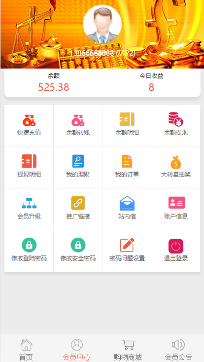3,所得收益可以直接提现,或者转账卖给其他会员,或者直接在购物商城里消费
