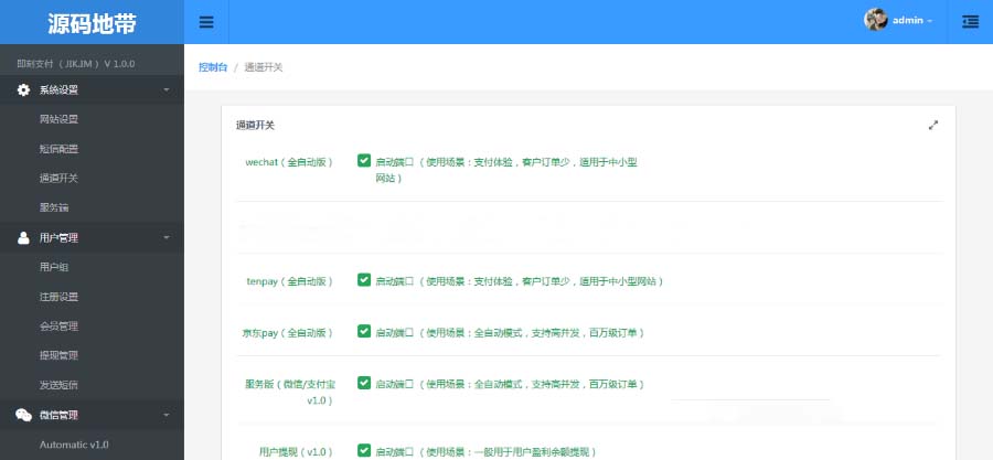系统盈利:1、开户,收取开户费,后端增加会员,设置费率,还可设置用户通道数量,