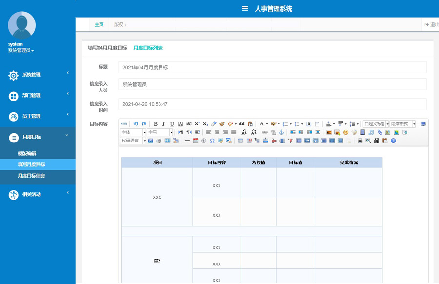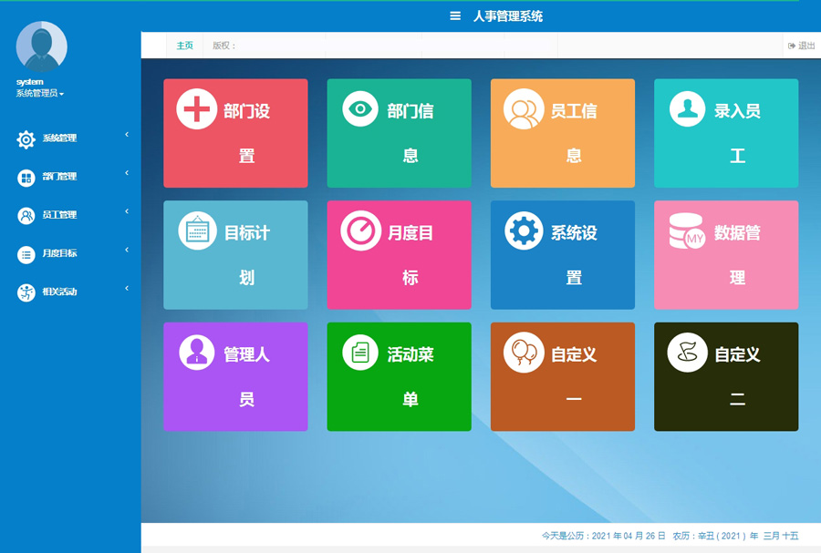 ThinkPHP3.2响应式人事系统源码,php漂亮高端的人事hr源码下载,包括部门管理、员工管理、月度目标、相关活动、管理员和角色管理。