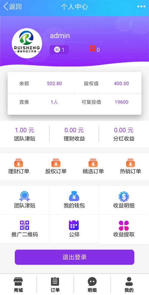 个人中心:可查看余额、股权值、直推人数、可复投值