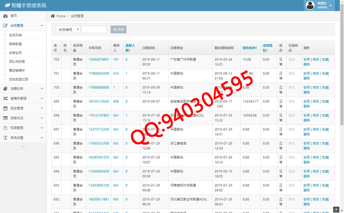 智赚手系统可谓碾压一切与之相对的对手,一款真的实实在在可以赚钱的系统,挂机都能躺着赚钱,智赚手管理系统可一人独大,进行主宰一切,对不守规矩的用户可进行封号,修改充值,功能非常强大,请自己试试