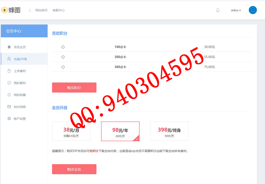 支持充值积分和VIP升级套餐: