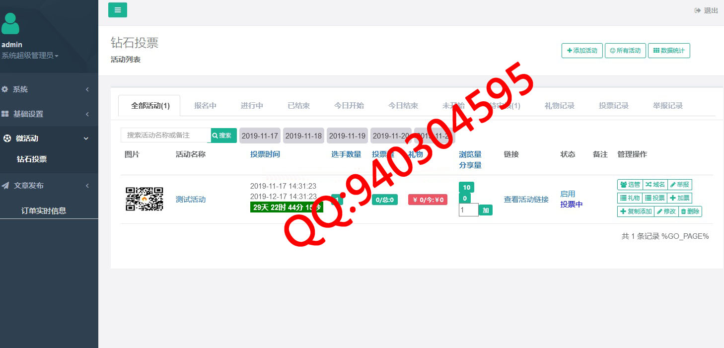 Thinkphp5投票系统微信扫码投票或者分享链接投票。后台自己添加活动看下效果,演示站用户ID是写死的,因为没有对接公众号。