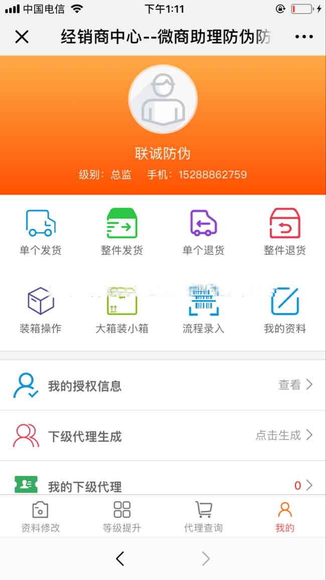 经销商后台功能更丰富,可发货,更新溯源,招代理,管理代理
