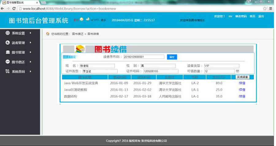 (11)单击“图书借还”/“图书续借”命令,对图书续借信息进行添加操作。