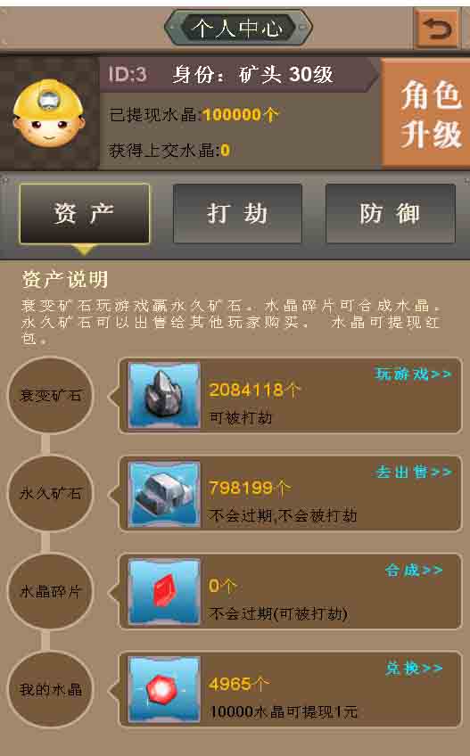 3、可打劫其它矿场的矿石,打劫可升级,级别越高,攻破防御越容易,获得的矿石越多,达到200级可打劫到水晶碎片等其它宝石,水晶碎片可合成水晶,10万合成1万水晶。
