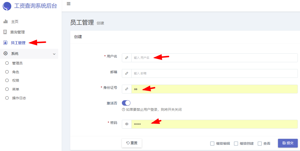 点击左侧菜单的【查询管理】,再点击【新建项目】输入项目名称,选择工资表excel文件后提交。注意工资表格式要求:第一行必须有“身份证号”,也就是必须有身份证号这一列,用于关联员工,并且是唯一的,不可相同。如下图所示: