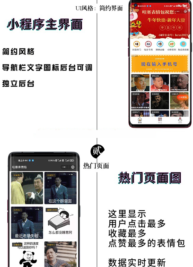 微信裂变小程序流量主表情包小程序源码全新独立后台微信小程序源码全开源,抖音最火表情包、潮图壁纸、精品头像长按图片可直接发送给好友,好友聊天框长按可直接添加到表情。