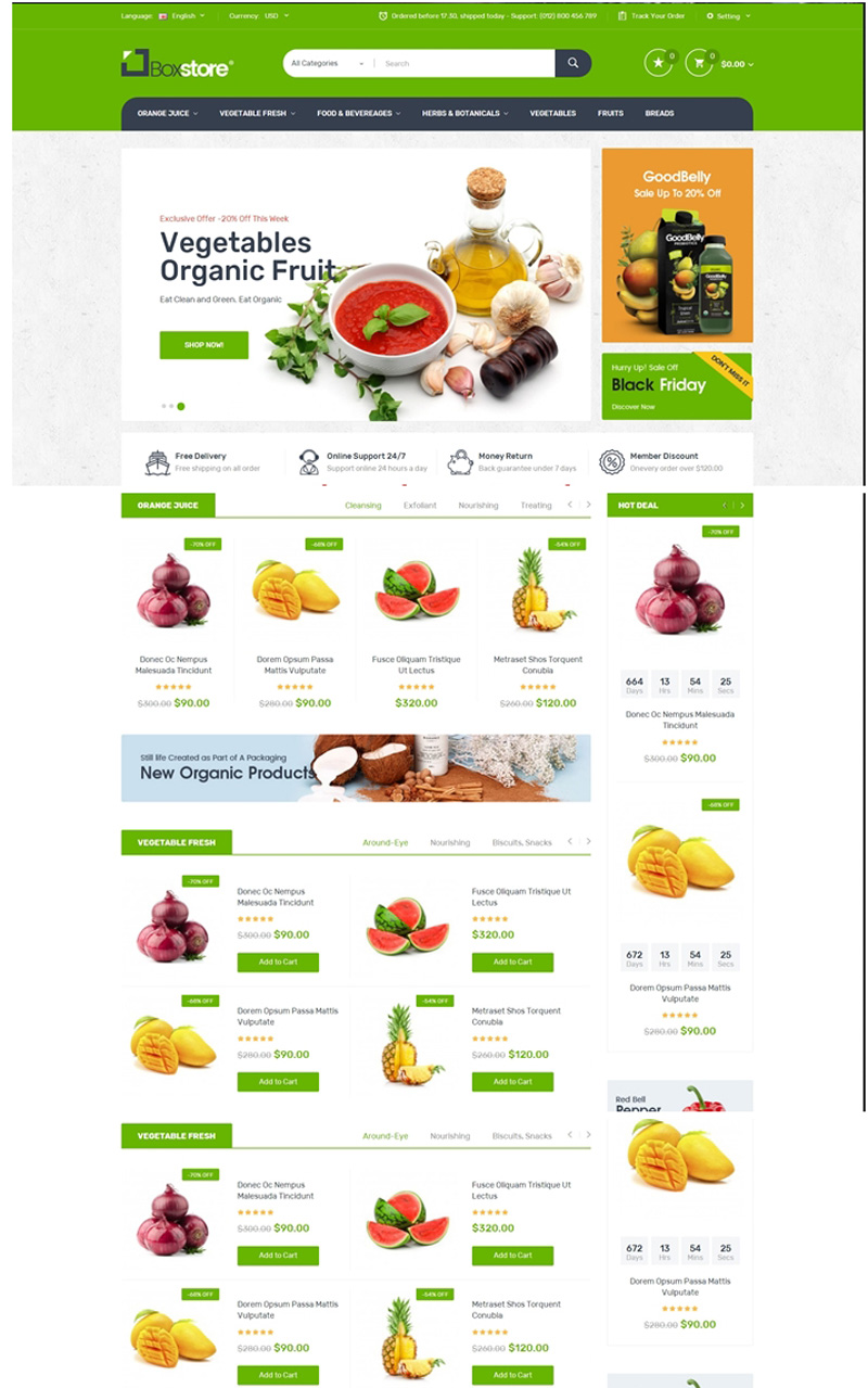 基于PHP开发的一款简洁绿色的楼层列表式生鲜水果蔬菜外贸商城模板,是一款英文版外贸商城通用模板,适用于各种购物商城使用,有兴趣的朋友可以了解一下。