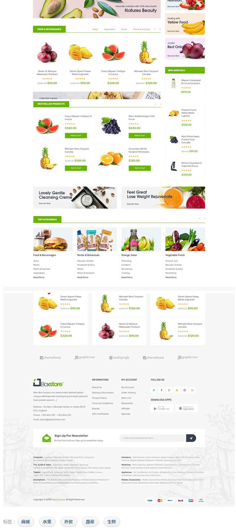 OPENCART外贸商城源码生鲜蔬菜水果食品备案站国外PHP模板中英文。