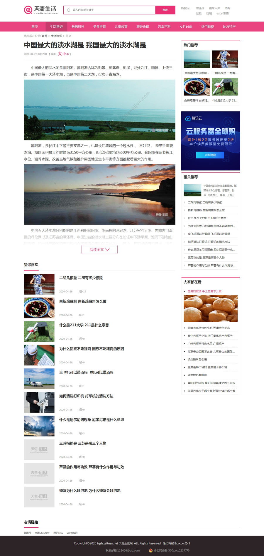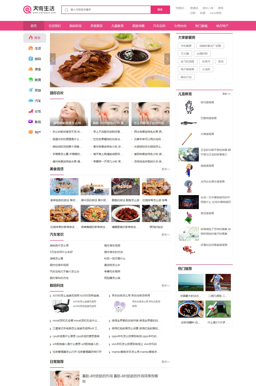 帝国生活常识数码科技美食推荐儿童教育旅游攻略汽车百科女性时尚热门影视地方特产综合生活百科类模板带采集器,帝国天奇生活网UI美化版带左侧导航和热门标签。