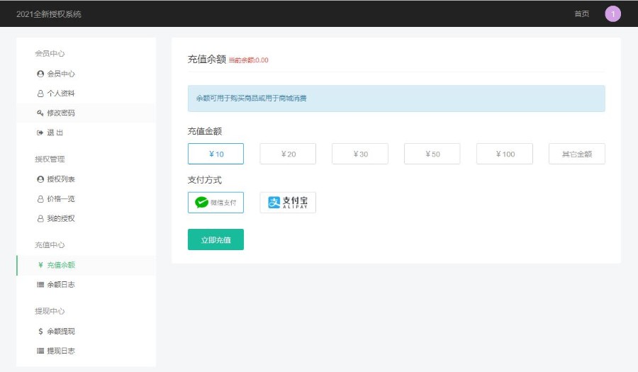 支持前台在线充值支付购买