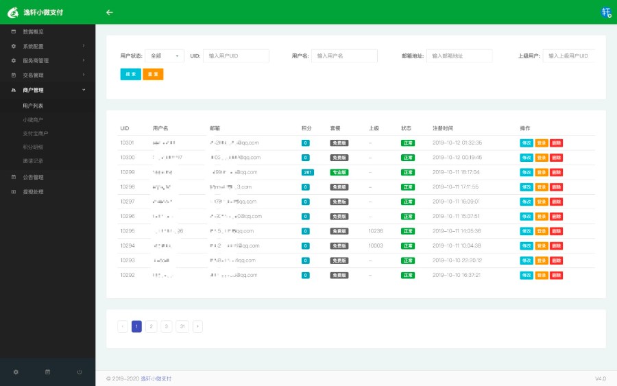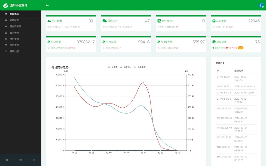 2.后台运营商:在后台添加微信服务商、支付宝服务商,可以添加多个,作为运营商我们的盈利主要靠API手续费,用户使用api会消耗积分,想要低手续费就可以买VIP包月/包年套餐,然后等着用户充值和买API套餐就好了,全程基本不用管,前台用户自己就能搞定,另外作为服务商还有微信和支付宝官方给的返佣,用户交易总额的0.2%-0.8%,就跟推广pos机和刷脸机的一样,只要下面用户消费,我们就有返佣,最容易的赚钱方式。