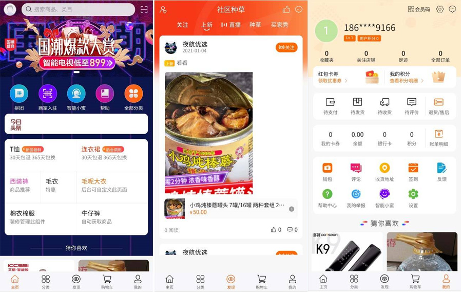 直播社交电商商城源码,带直播电商功能,可以DIY前端,后台一键生成H5和小程序客户端,一般商城常用功能齐全。