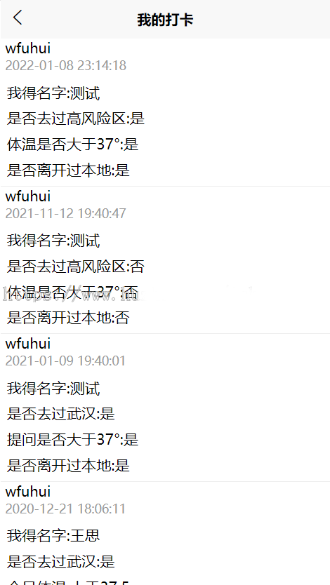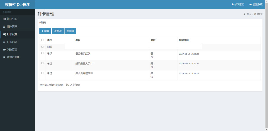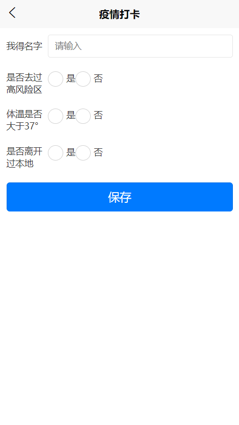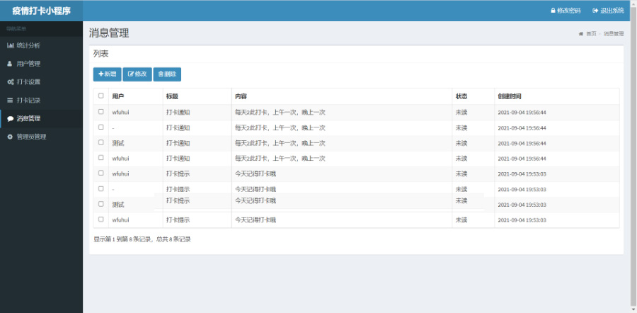 首页展示登录人信息,疫情打卡,个人信息,打卡记录,消息,密码修改
