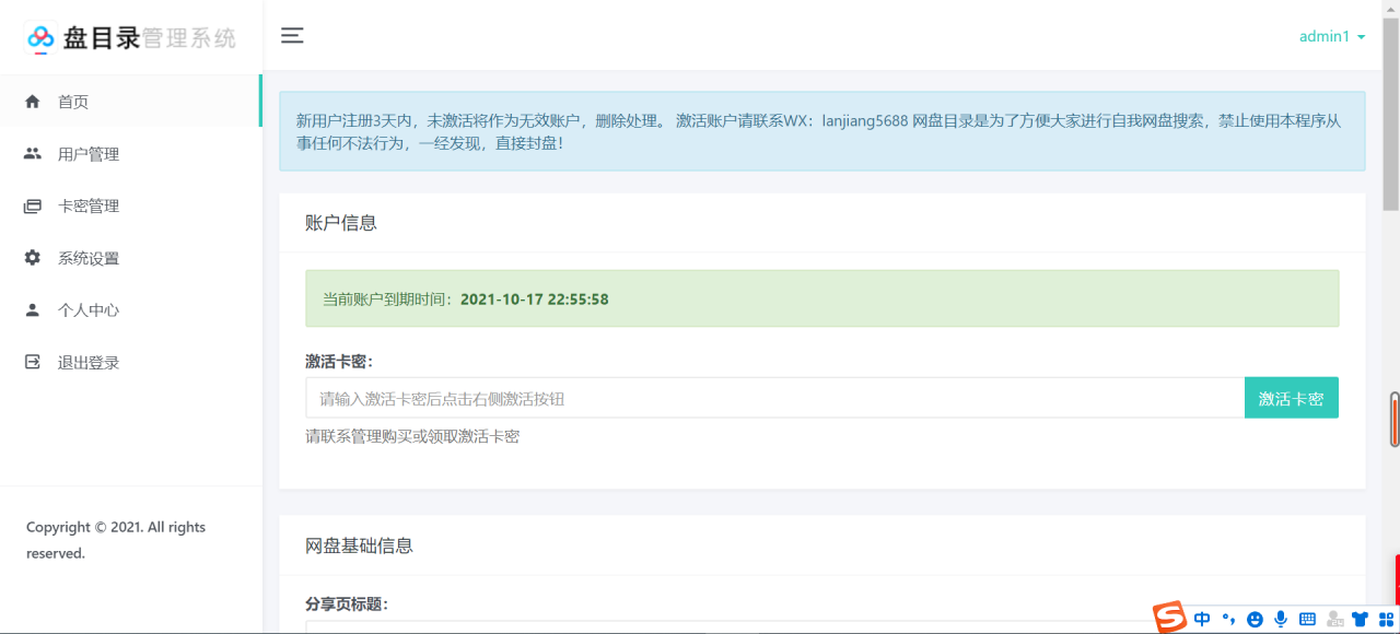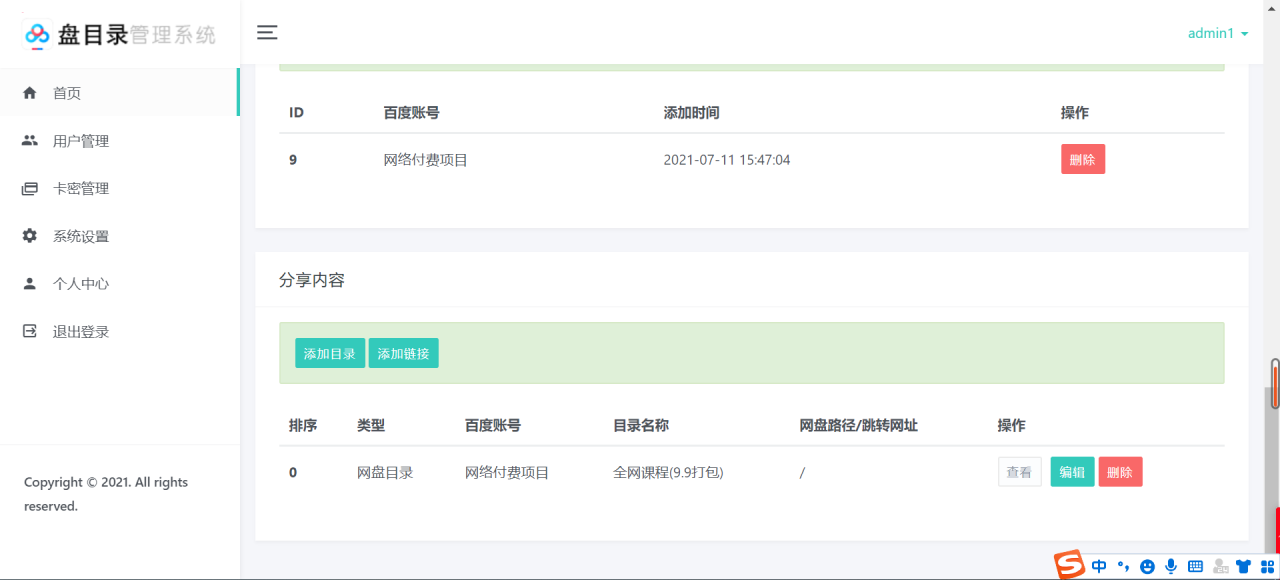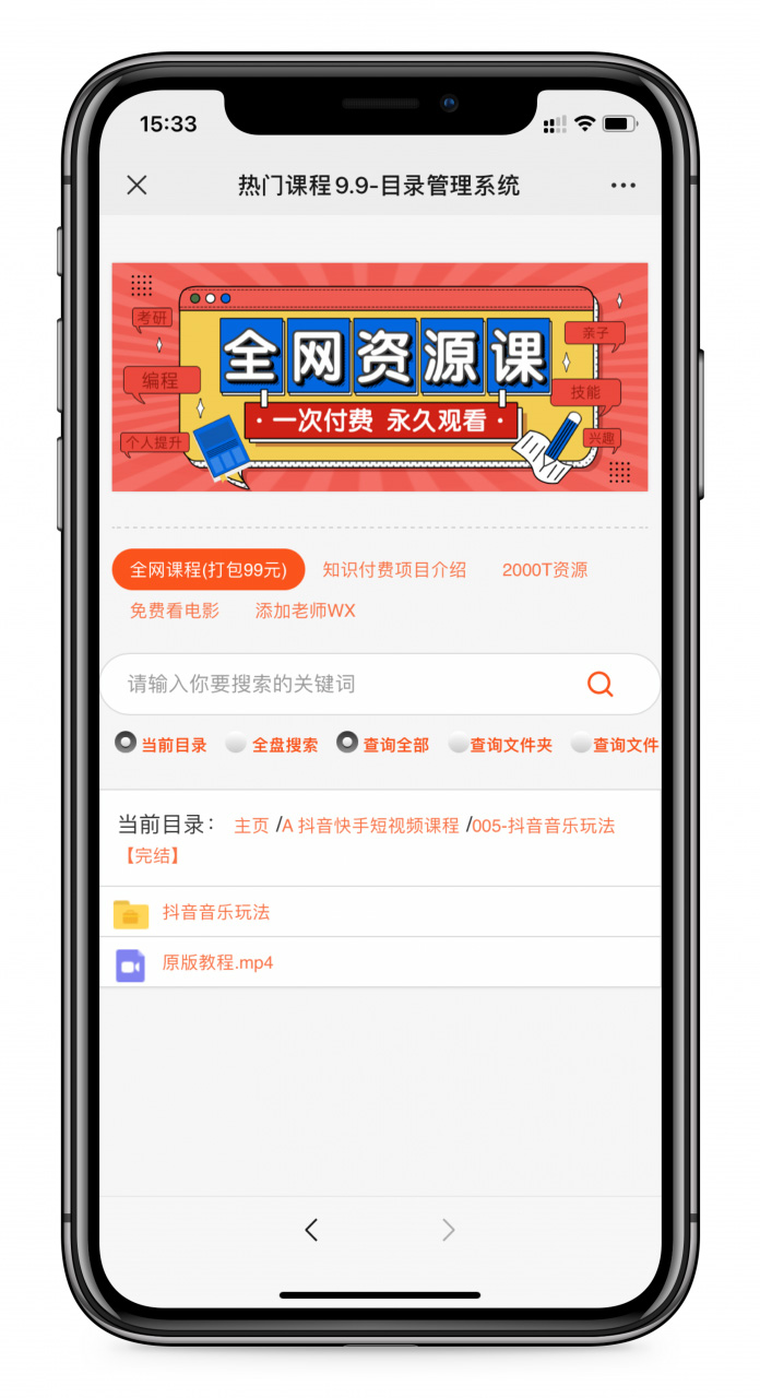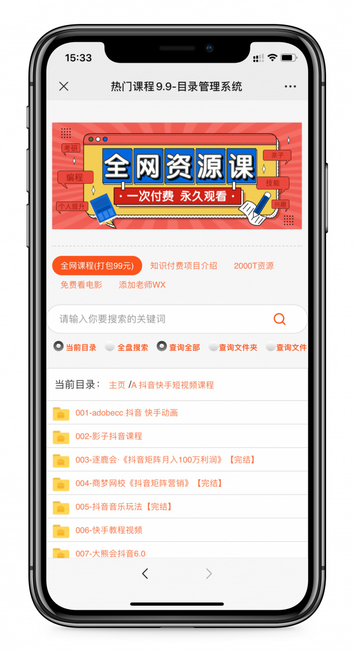 主要用途:很多的商家一般资源都存在百度网盘,如果做成文档一个个的展示给买家比较麻烦,所以用这个目录展示检索搜索系统就比较方便了,直接授权就可以展示了并且不能下载。同时还可以在上方添加海报or自定义链接,可以推广其他的东西或者添加联系客服的方式等。