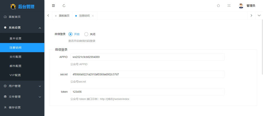 账号密码自行注册登录 微信扫码未开启 需要备 案域名配合公众号