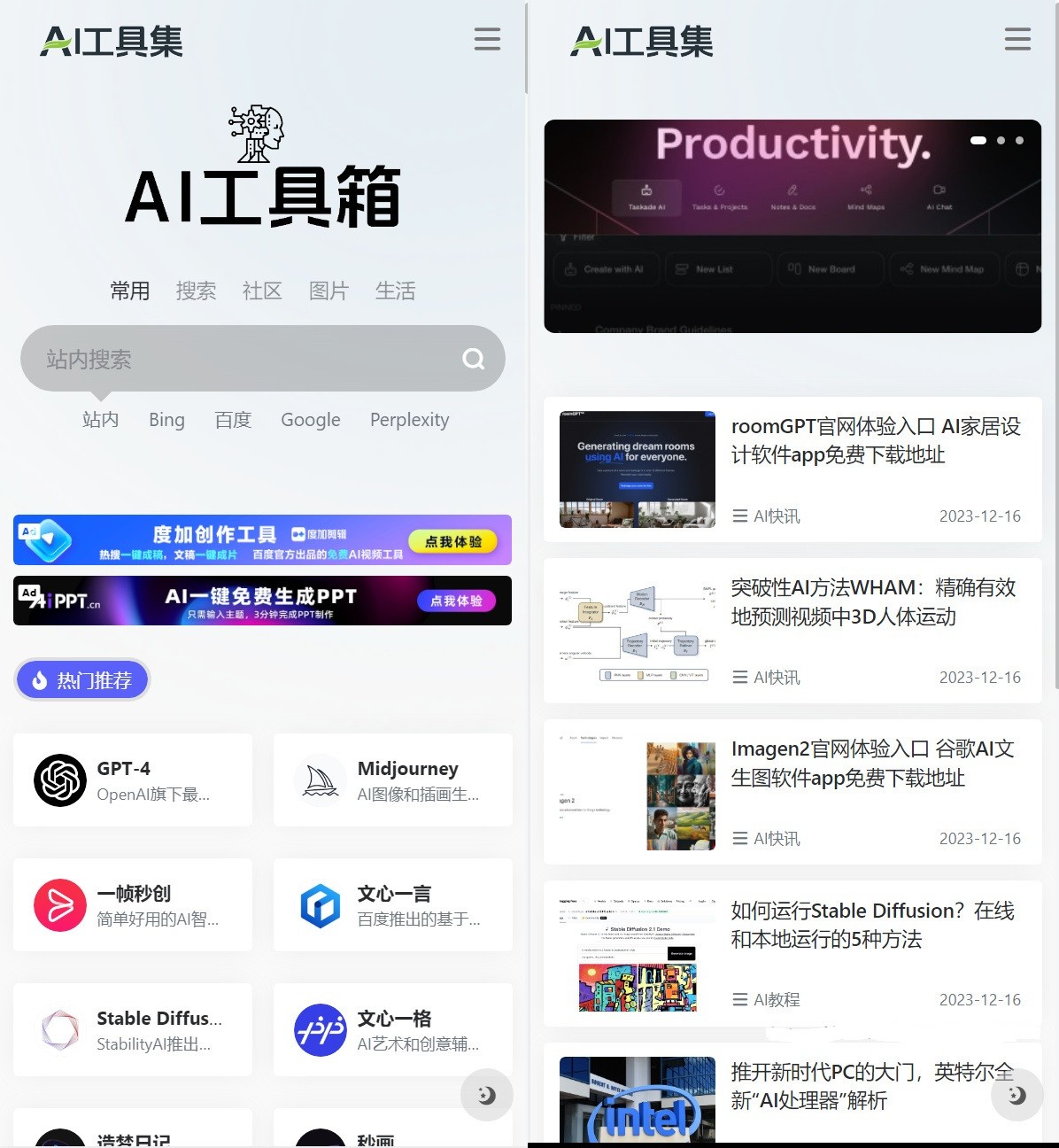 内置了500+国内外各类优质AI站点及工具,助你搭上人工智能浪潮,自动化高效完成任务,借助AI资源站点引流盈利。 AI导航系统,涵盖国内外500+AI工具集合精选网站,覆盖AI写作工具、AI图像工具、AI视频工具、AI音频工具、AI编程工具、AI音乐工具、AI设计工具、AI对话工具等AI工具全类,以及AI学习开发的常用网站、框架和模型 搭建设备需求。