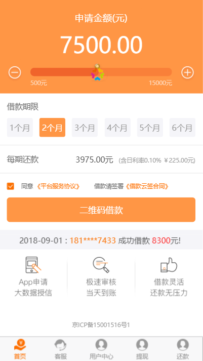 13、前台贷款增加二维码贷款功能,使运营方不使用第三方支付平台的情况下,实现放款;大大节约运营成本!